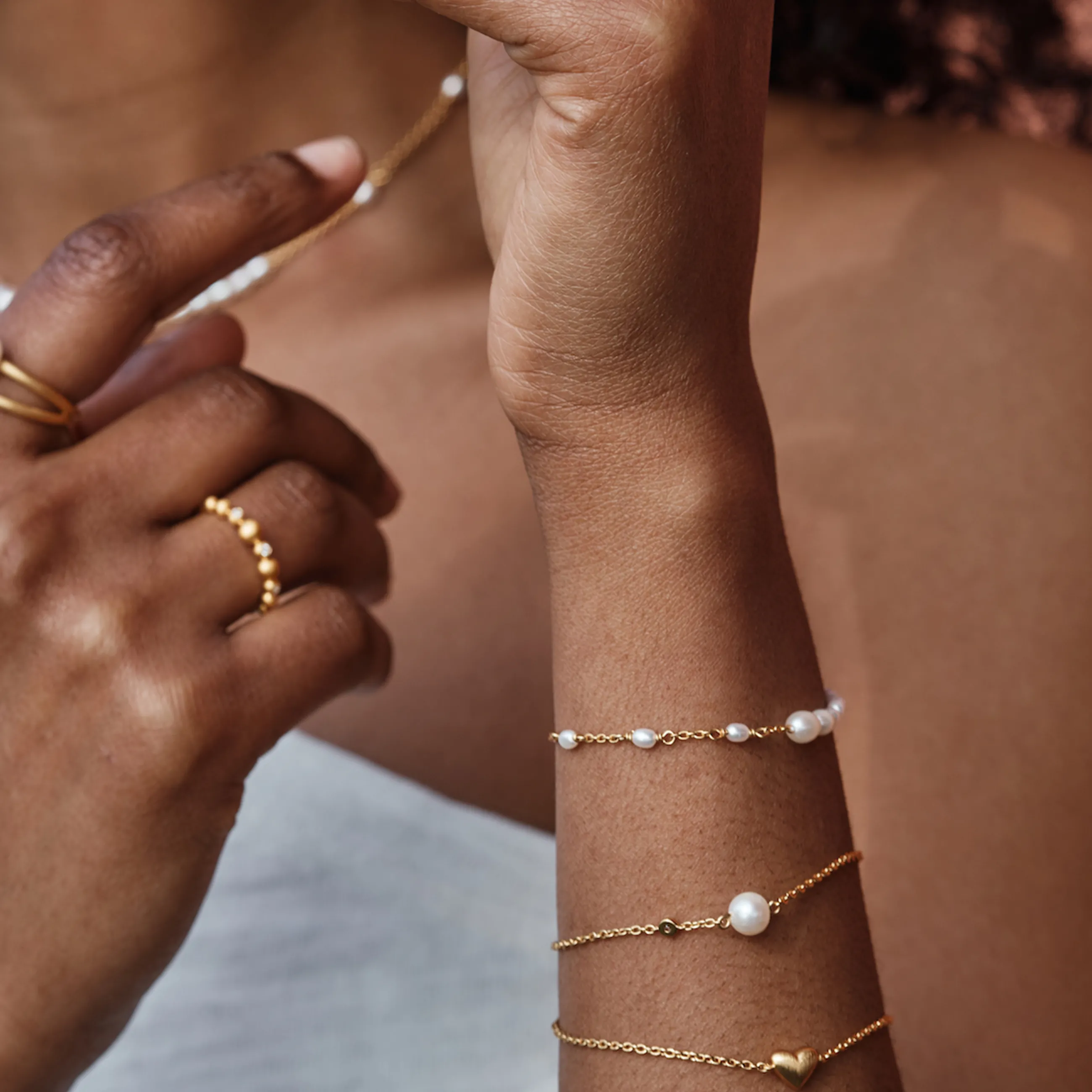 Kan bruges som ankelkæde med en extension. Materiale14K forgyldt sterling sølv med ferskvandsperler.StørrelseLængde…